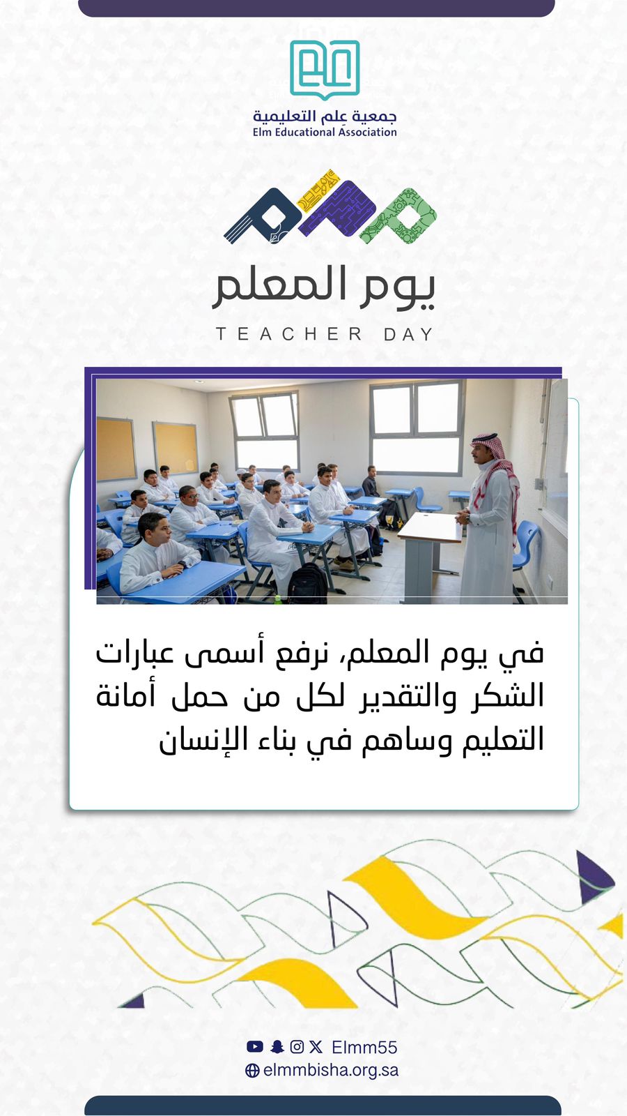 يُشكِّل المعلم الركيزة الأساسية لبناء الإنسان وتنمية المجتمع. في #اليوم_العالمي_للمعلم نُكرّم أصحاب الرسالة السامية ونثمّن جهودهم في صناعة المستقبل.