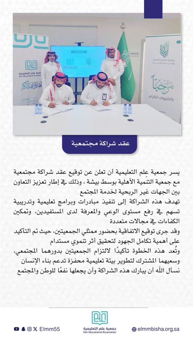 في إطار تعزيز التعاون والشراكة المجتمعية، وقّعت #جمعية_علم_التعليمية اتفاقية تعاون مع #جمعية_التنمية_الأهلية_بوسط_بيشة وذلك انطلاقًا من حرص الجهتين على توحيد الجهود في مجالات التنمية والتعليم وخدمة المجتمع، سائلين الله أن يُبارك هذه الشراكة ويجعل فيها النفع والخير للجميع.